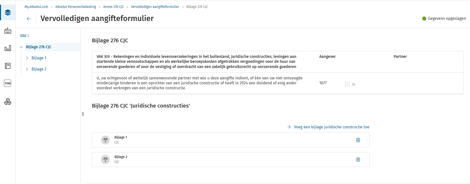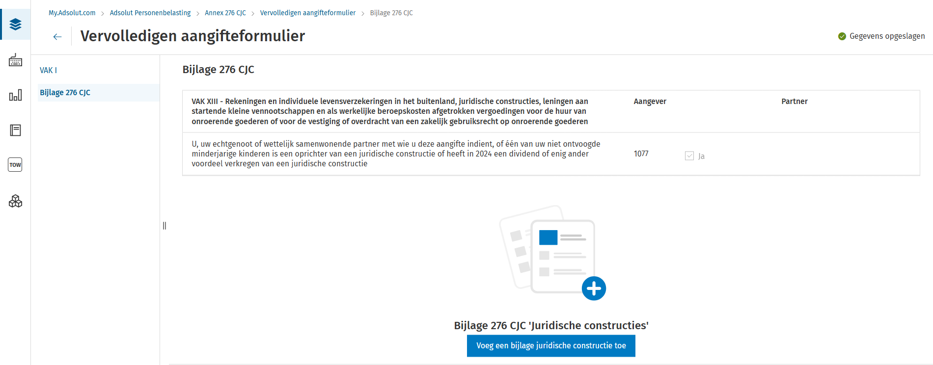 Tax-on-web: Bijlage 276 CJC Het invullen van de verplichte bijlage 276 CJC voor juridische constructies is in het programma voorzien via fiscale hulp "Vervolledigen aangifteformulier". Dit menu-item is beschikbaar van zodra de code 1077 via manueel wordt aangekruist. In het hulpscherm kunnen één of meerdere bijlages worden toegevoegd.