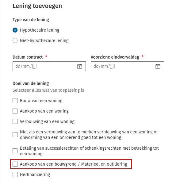 Nieuw leningsdoel toegevoegd: ‘Aankoop van een bouwgrond / Materieel en outillering’ Vanaf nu is het mogelijk om in het hulpscherm 'Onroerende goederen en leningen' een lening toe te voegen aan een woning met als specifiek doel ‘Aankoop van een bouwgrond / Materieel en outillering’. Het programma houdt hierbij automatisch rekening met de bijhorende fiscale voordelen voor dit type lening.