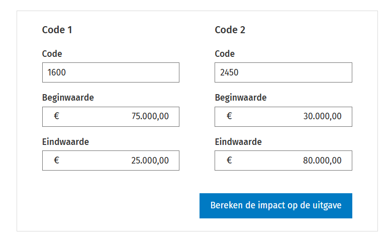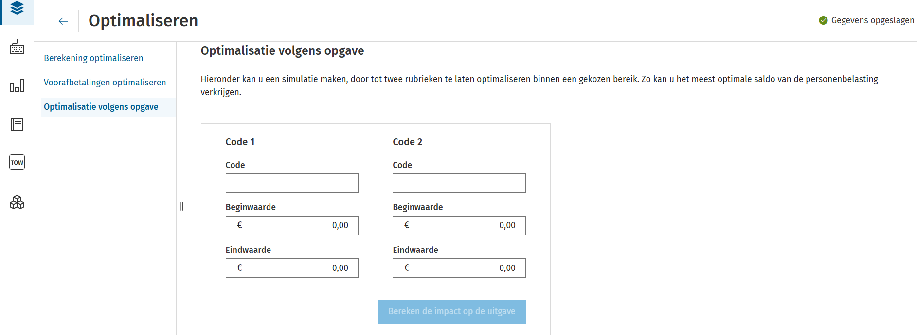 Hier kan u tot twee rubrieken te laten optimaliseren binnen een gekozen bereik, om zo het meest optimale saldo van de personenbelasting te verkrijgen. Zodra een geldige code werd ingevuld is de rekenknop beschikbaar.