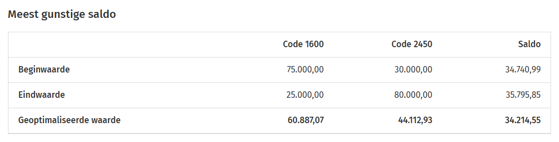 Na het berekenen komen er 2 resultatenkaders zichtbaar. 'Meest gunstige saldo' toont de waard(en) voor de code(s) binnen het gekozen bereik waarbij het meest gunstige resultaat op het saldo van de personenbelasting bekomen kan worden.
