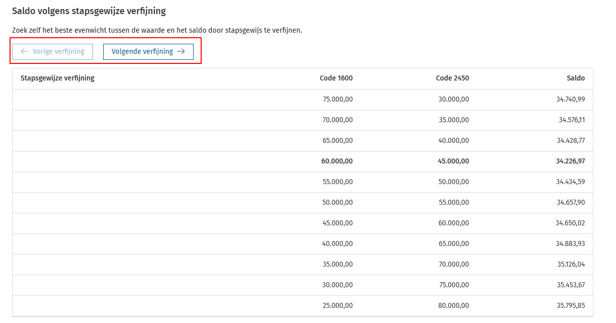 Bij 'Saldo volgens stapgewijze verfijning' kan u zelf de stappen van de optimalisatie doorlopen, door de berekening verder te laten verfijnen door middel van de knop 'Volgende verfijning'. In de meest verfijnde berekening zal het resultaat overeenkomen met de berekening van het 'Meest gunstige saldo'. Opmerking: In een latere fase zal het mogelijk worden om een rapport te genereren van de gemaakte berekening.