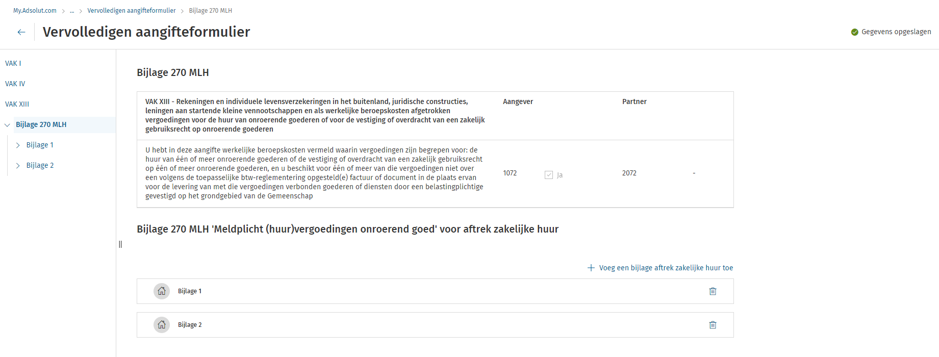 Het invullen van de verplichte bijlage 270 MLH voor huur en huurlasten is in het programma voorzien via fiscale hulp "Vervolledigen aangifteformulier". Dit menu-item is beschikbaar van zodra de code 1072/2072 via manueel wordt aangekruist.