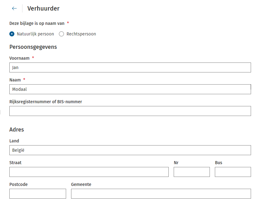 Bij de verhuurders kunnen zowel natuurlijke als rechtspersonen ingevuld worden. Afhankelijk van de keuze worden de noodzakelijke invulvelden actief.