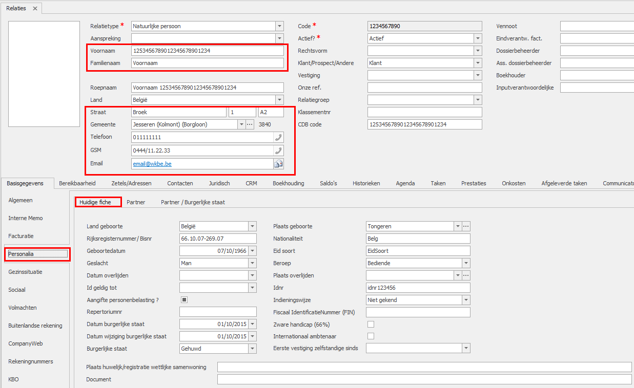 - Open het detailscherm (via F2) van de relatie en controleer de gegevens die betrekking hebben op Personenbelasting.