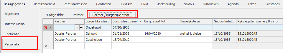 Gegevens van de partner en de burgerlijke staat:Hier kan u de historiek invullen van de burgerlijke staat en de partner.