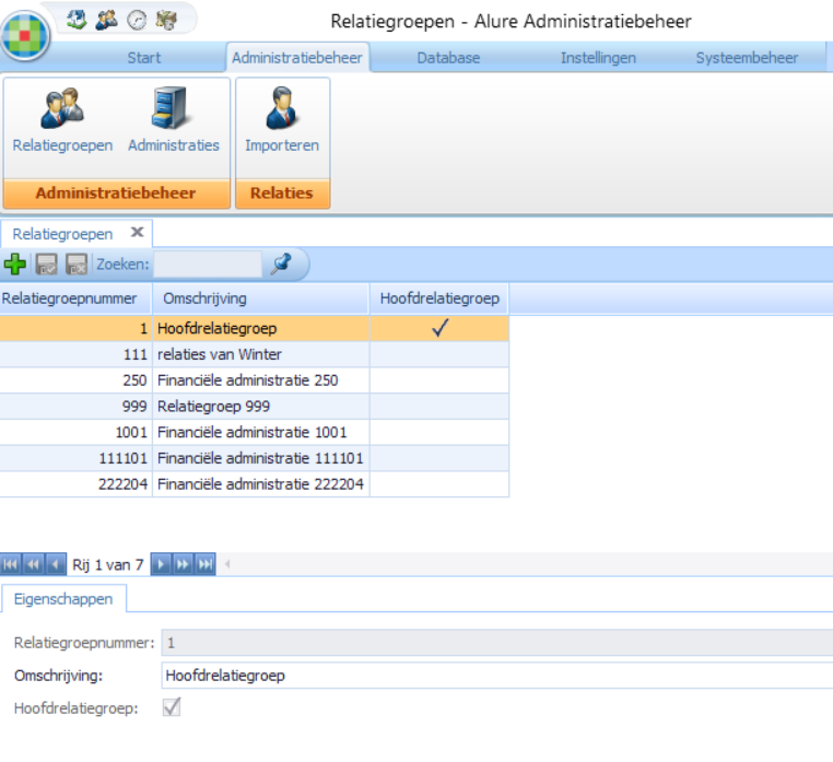 1. RelatiegroepenHier worden de verschillende Relatiegroepen en de omschrijving getoond. Ook zie je welke relatiegroep de Hoofdrelatiegroep is, in veel gevallen zal dit nummer 1 zijn.