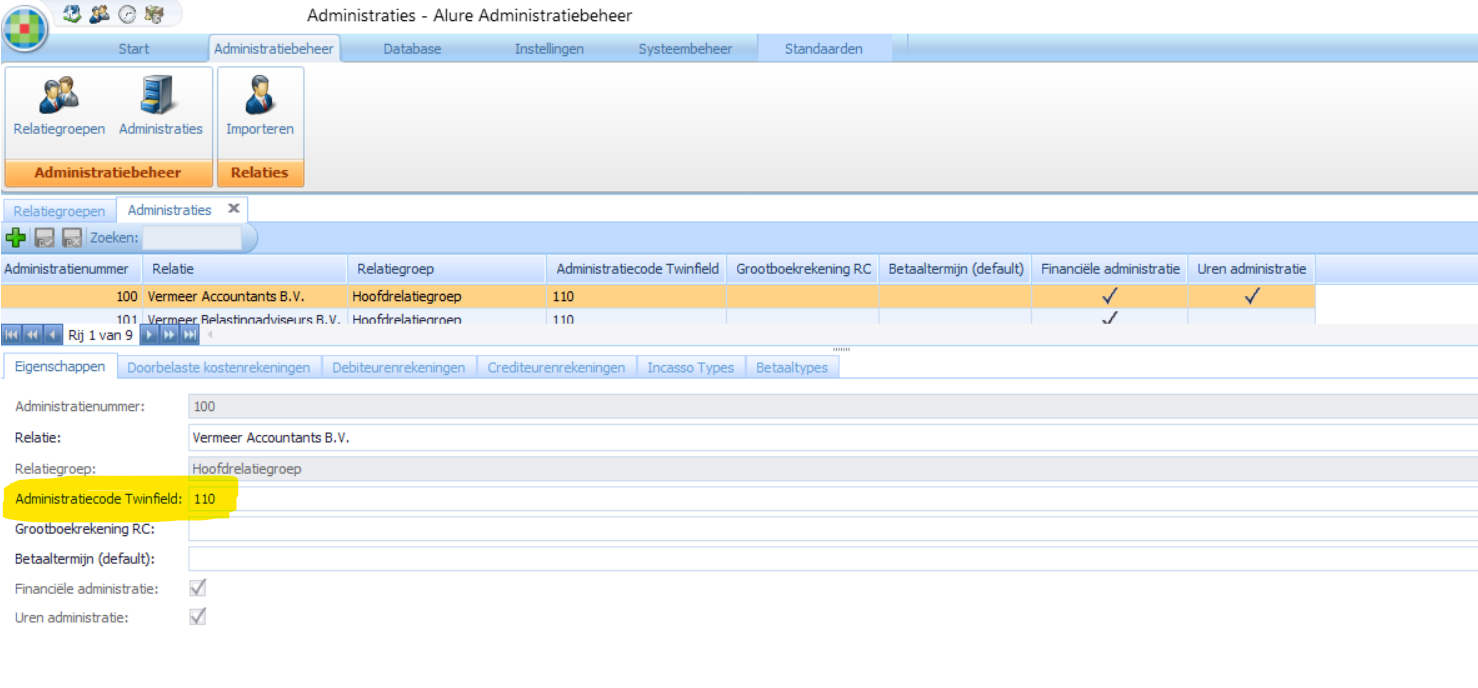 2. AdministratiesHier kan worden opgevraagd aan welke administratiegroep de administratie gekoppeld is. Er kunnen meerdere administraties gekoppeld zijn aan dezelfde relatiegroep. Ga naar het tabblad eigenschappen voor het tonen van meer gegevens en de relatie die gekoppeld is aan de administratie.