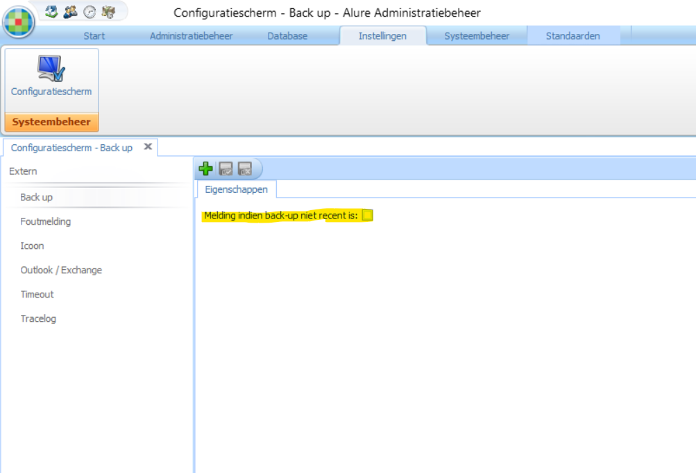 Mijn Alure > Administratiebeheer > Instellingen > Configuratiescherm > Extern > Back-up kan het vinkje bij