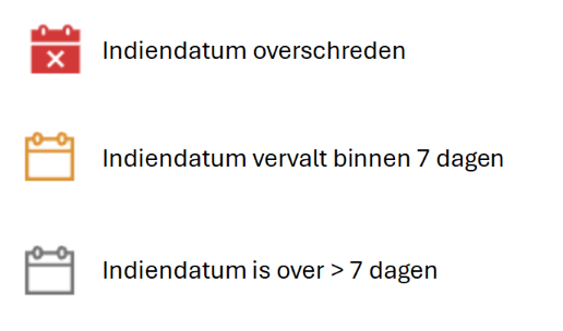 Zijn er indiendata ingesteld voor de vragenlijst dan zie je dit bij de vraag. Afhankelijk wanneer de vraag vervalt zal een ander gekleurd icoon getoond worden: