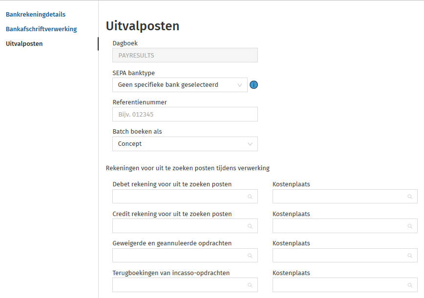 - Batch boeken als: stel hier in hoe uitvalposten standaard verwerkt moeten worden. Keuze uit: