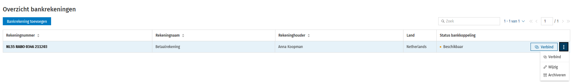 Zodra alle velden geldig zijn, kies dan [Aanmaken]. De bankrekening is zichtbaar in het overzicht.