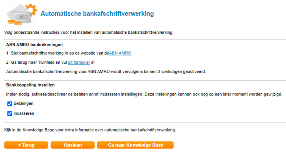 - Geef aan of er gebruik gemaakt gaat worden van de optie om betaal- en incassobestanden rechtstreeks vanuit Twinfield naar ABN AMRO door te sturen. Standaard zijn deze opties actief, maar kunnen uitgezet worden.