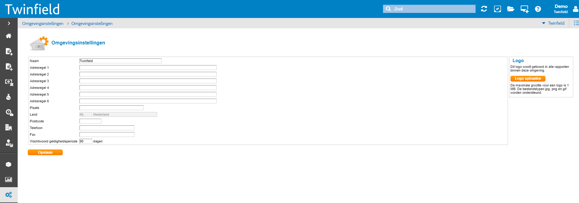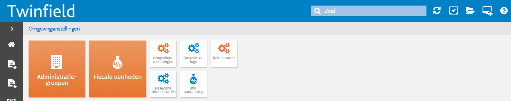 Onder de omgevingsinstellingen kunnen diverse instellingen worden aangepast. Er kunnen administratiegroepen worden aangemaakt, fiscale eenheden worden ingesteld en kan het bedrijfslogo worden ingesteld.