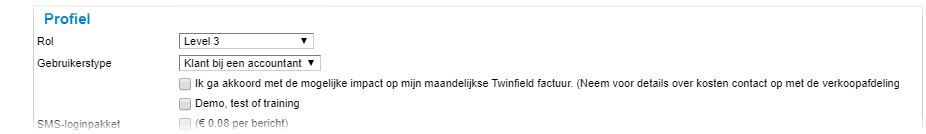 - SMS-loginpakket: Markeer deze optie om voortaan in te loggen met een unieke eenmalige code die de gebruiker via SMS ontvangt. Deze verificatiestap verhoogt de beveiliging van de toegang tot de applicatie. Er worden geen kosten in rekening gebracht aan de eigenaar van de mobiele telefoon. De kosten worden gefactureerd met de abonnementsbedragen.