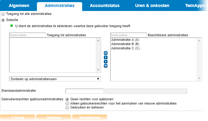 - Selectie: Kies uit de beschikbare administraties (rechterkolom) welke administraties in het vervolg voor de gebruiker toegankelijk zijn. Voor meer informatie, zie artikel: Kan ik een gebruiker tot meer dan één administratie toegang geven?