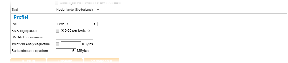 - Uitnodigen voor Wolters Kluwer Account: Bij het plaatsen van een vinkje ontvangt de gebruiker een uitnodiging per e-mail om de inlogmethode via een Wolters Kluwer Account te activeren. Voor meer informatie, zie het artikel: Hoe kan ik gebruikers vanuit Twinfield Boekhouden uitnodigen voor het Wolters Kluwer Account?