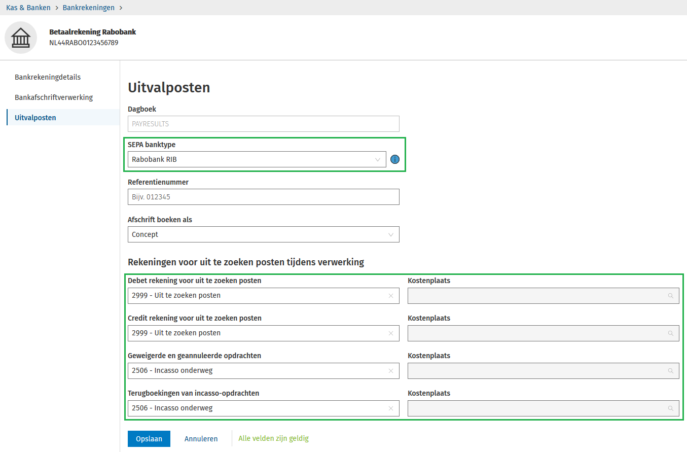 Het tabblad Uitvalposten wordt gebruikt voor het verwerken van mislukte, geweigerde en gestorneerde incasso's. Als je ook maar één van deze velden niet instelt, dan kan een incasso die wordt geblokkeerd of die wordt terug gestort niet goed worden verwerkt in de administratie.
