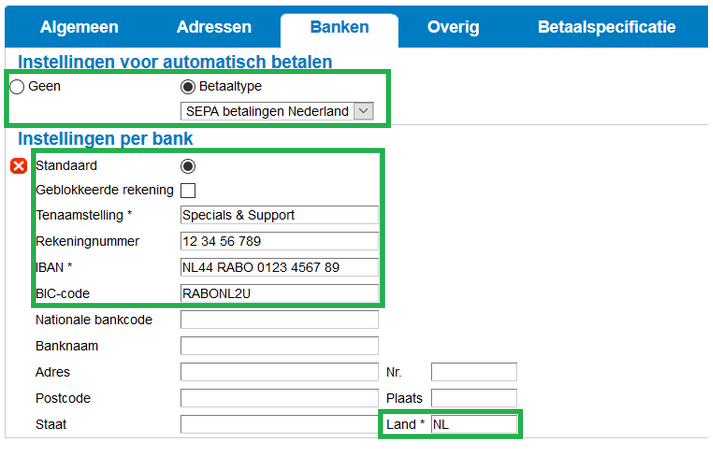 Hoe maak ik een nieuwe debiteur of crediteur aan?Voor het maken van een betaalbestand zijn in de stamgegevens van de leverancier ten minste de gegevens nodig die hieronder groen zijn omlijnd.