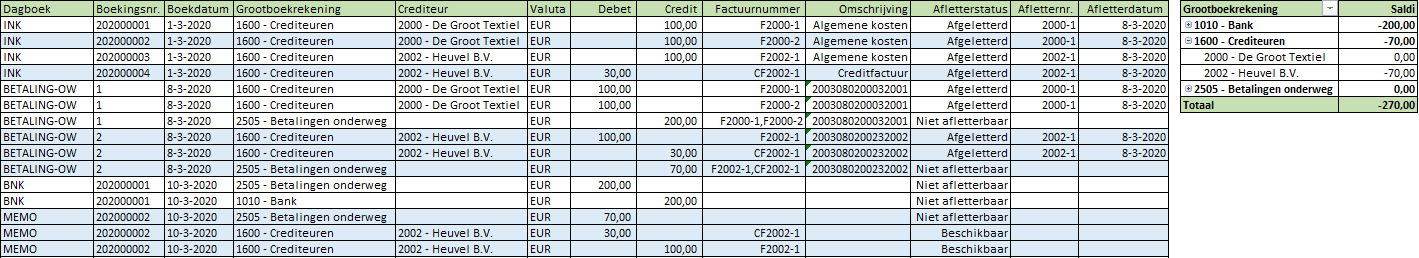 Vervolgens wordt de 70 euro die betaald moest worden aan Heuvel B.V. via het dagboek Memoriaal overgeboekt vanaf de tussenrekening naar de grootboekrekening Crediteuren onder vermelding van de betreffende crediteur. Omdat de 70 euro bestaat uit een gewone factuur van 100 euro en een creditfactuur van 30 euro worden beide facturen weer opengezet op de openstaande postenlijst.