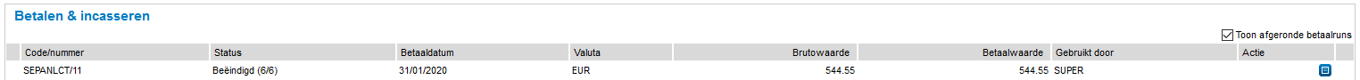 Openstaande posten zijn weer beschikbaar voor een nieuwe betaalronde. We raden je aan om een betaalronde pas af te ronden op het moment dat het bankafschrift is verwerkt in de administratie. Het voordeel hiervan is dat je de betaalronde dan nog eenvoudig met één druk op de knop kunt terugdraaien.