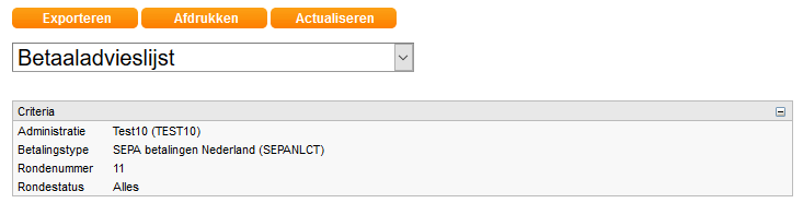 Je kunt de betaaladvieslijst van de afgeronde betaalronde exporteren naar Excel. De betaaladvieslijst kun je openen door op het blauwe knopje met het vierkantje te klikken bij de betaalronde.