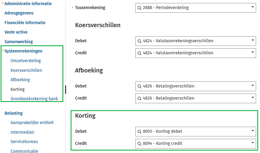 Ga naar Instellingen > Administratie-instellingen > Administratie-instellingen: Systeemrekeningen. Bij debet en credit kan indien gewenst dezelfde grootboekrekening worden gekozen.