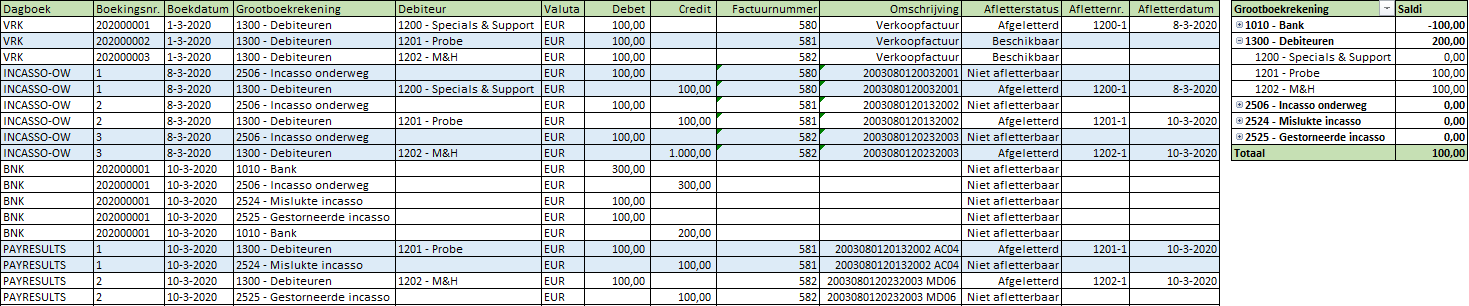 Zie de boekingsgang hieronder ter voorbeeld. Het toont het incassoproces voor 3 incasso's. Van deze 3 incasso's is factuurnummer 580 geslaagd, factuurnummer 581 mislukt en factuurnummer 582 gestorneerd. In deze boekingsgang is bij het betaaltype gekozen voor Detail en wordt er gebruik gemaakt van een tussenrekening. In dit artikel wordt uitgelegd wat de verschillende manieren zijn om te incasseren: