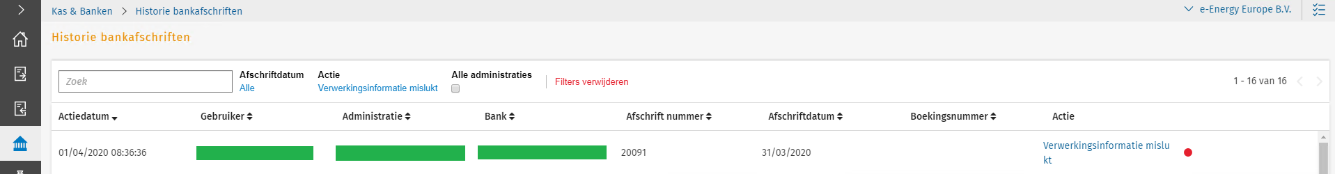Extra controlestapGa naar Kas & Banken > Historie en zet het filter Actie op Verwerkingsinformatie mislukt en het filter Afschriftdatum op de filter van het bankafschrift. Controleer of je hier een foutmelding ziet staan.