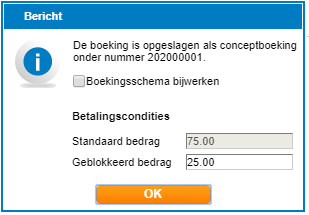 Bij het opslaan van de inkoopboeking wordt een bericht met betalingscondities voor standaard bedrag en geblokkeerd bedrag getoond. Klik vervolgens op [OK] om verder te gaan.