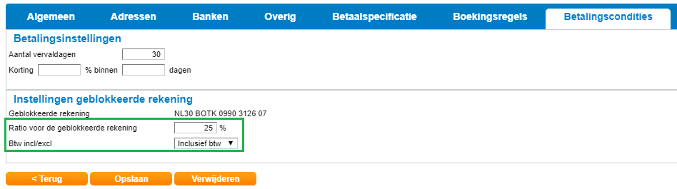 Ga vervolgens naar het tabblad Betalingscondities. Hier kan een percentage worden ingevuld dat wordt gebruikt om te berekenen welk bedrag van de inkoopfactuur naar de g-rekening moet worden overgemaakt.