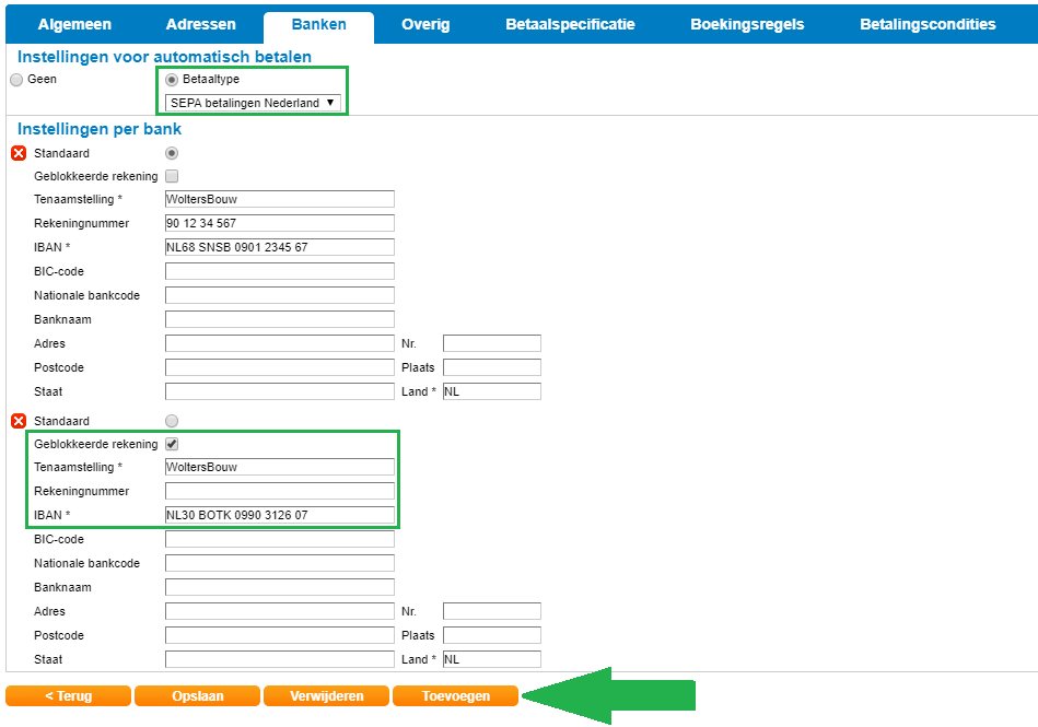 Open de betreffende crediteur en ga naar het tabblad Banken. Hier kan de geblokkeerde rekening worden toegevoegd. Gebruik hiervoor de knop [Toevoegen]. Zet bij de bankrekening die je toevoegt het vinkje Geblokkeerde rekening aan.