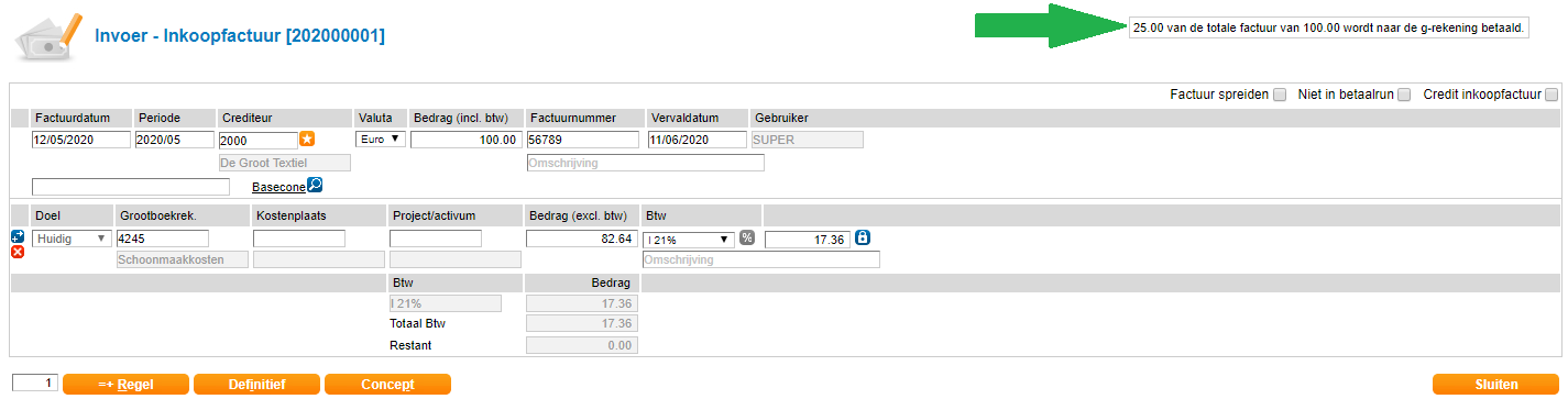 Voer de inkoopboeking die gedeeltelijk aan een g-rekening betaald moet worden in op de gebruikelijke manier. Twinfield gaat na welke instellingen er op de crediteurenkaart zijn gemaakt en berekent op basis van het ingestelde percentage welk bedrag moet worden overgemaakt naar de g-rekening.