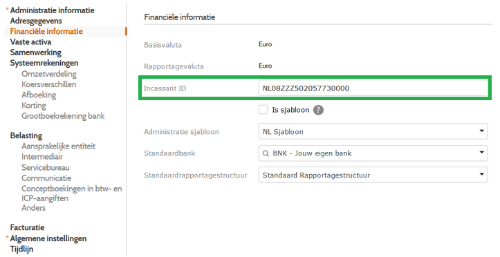 Een incassant ID kun je instellen bij de administratie-instellingen. Ga naar Instellingen > Administratie-instellingen > Administratie-instellingen: Financiële informatie.