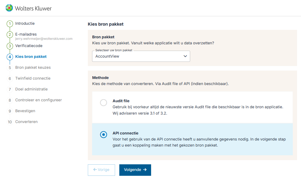 Selecteer het bronpakket waar vanuit je wilt converteren. In de uitklaplijst staan alle bronpakketten die de conversietool kan converteren. In dit artikel is AccountView gekozen als bronpakket. Bij de methode van converteren kun je kiezen om via auditfile te converteren of via de API. Indien je kiest voor API, dan dien je in de volgende stap de verbinding te maken met het bronpakket.