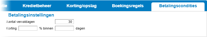 De velden in de sectie 'Betalingsinstellingen' te weten 'Aantal vervaldagen', '% Betaalkorting' en 'Dagen betaalkorting' komen overeen met de opties van de sectie Betalingscondities van de blauwe tegel 'Klanten'. Meer informatie over de betalingskorting bij een debiteur, zie het artikel Hoe kan ik korting toepassen in een verkoopfactuur?