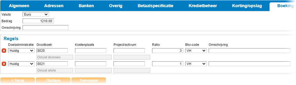 Als de opbrengsten van de klant geregeld op dezelfde grootboekrekeningen worden verwerkt, stel dan vaste boekingsregels voor deze debiteur in. Dit komt de snelheid en accuraatheid van de boekingsgang ten goede. Let op: Deze boekingsregels zijn overigens alleen van toepassing op de invoer van verkoopboekingen via de functie 'Invoer' van de module Classic Facturatie (of Basecone). In het artikel Hoe maak ik boekingsregels aan voor debiteuren of crediteuren? wordt uitgelegd hoe deze boekingsregels voor een relatie aan te maken en/of te bewerken.