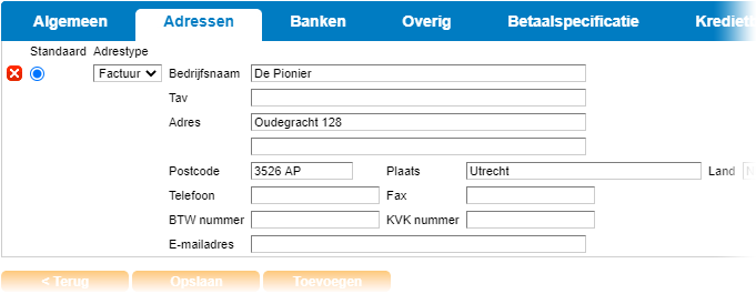 Velden op dit tabblad corresponderen met de benoemde invoervelden van de sectie Adressen bij de blauwe tegel 'Klanten'. Gebruik op het tabblad 'Adressen' eventueel de oranje knop [Toevoegen] om meerdere adressen aan de relatie te verbinden. Geef bij meerdere adressen vervolgens aan (met behulp van de radiobutton 'Standaard') wat het standaardadres is. Gebruik de rode button [X] om een adres te verwijderen.