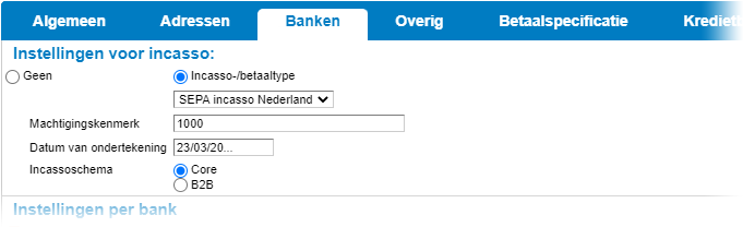Het tabblad biedt de optie om één of meer bankrekeningnummers te koppelen aan de debiteur. Naast de herkenning van de relatie bij het inlezen van bankafschriften, biedt het toevoegen van een rekeningnummer ook de mogelijkheid om vanuit de toepassing de debiteur mee te nemen in een incassobestand voor de bank. Voor de laatstgenoemde functie, is de sectie 'Instellingen voor incasso:' beschikbaar.