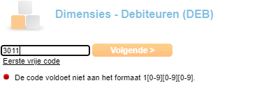 Bij het aanmaken via de oranje tegel 'Debiteuren' geef je voor de nieuwe debiteur zelf een beschikbare code op. Deze code dient te voldoen aan het formaat dat bij het dimensietype 'DEB' is vastgelegd. Voor een vooraf ingerichte administratie is dat '1[0-9][0-9][0-9]'.