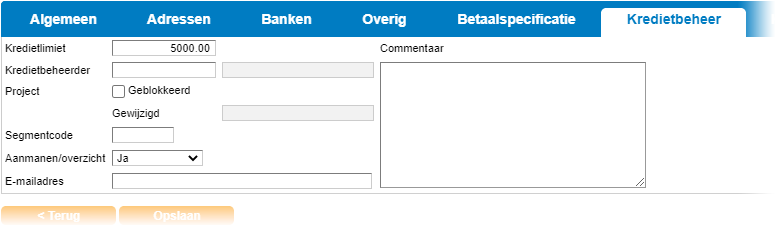 De velden op dit tabblad komen nagenoeg overeen met de eerder behandelde opties van de sectie Kredietbeheer van 'Klanten' (blauwe tegel). Dit tabblad is hoofdzakelijk van toepassing op de functie 'Aanmanen' en 'Bellijsten' van de module Classic Facturatie. Voor meer informatie, zie artikel: Is er een handleiding voor de module kredietbeheer?