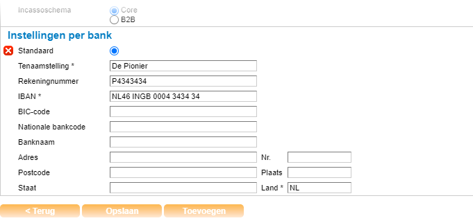 Gebruik de oranje knop [Toevoegen] om eventueel meerdere rekeningnummers voor de debiteur vast te leggen. Markeer dan wel welke rekeningnummer de standaardrekening is. De standaardrekening van de debiteur wordt vervolgens gebruikt voor incasso-opdrachten. Zie ook: Betalen & incasseren - Bankrekeningen van klanten vastleggen. Klik op de rode button [X] om een rekeningnummer bij de relatie te verwijderen.
