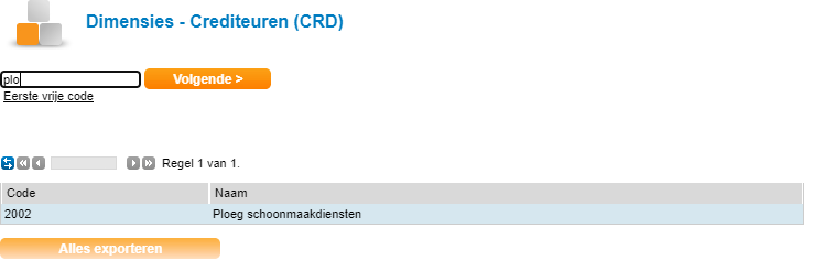 Zoek de gewenste relatie op door naar Financiële professionals > Dimensies > Crediteuren/Debiteuren te gaan. In dit voorbeeld wordt uitgegaan van de dimensie 'Crediteuren'. Geef in het veld 'Code' de code van de crediteur op. De corresponderende relatie verschijnt en is vervolgens aanklikbaar.