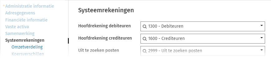 - In de velden 'Hoofdrekening debiteuren' & 'Hoofdrekening crediteuren' zijn de ingestelde grootboekrekeningen zichtbaar. Deze invoer wordt in de basis overgenomen uit de sjabloonadministratie bij het aanmaken van een nieuwe administratie. De velden zijn wijzigbaar.