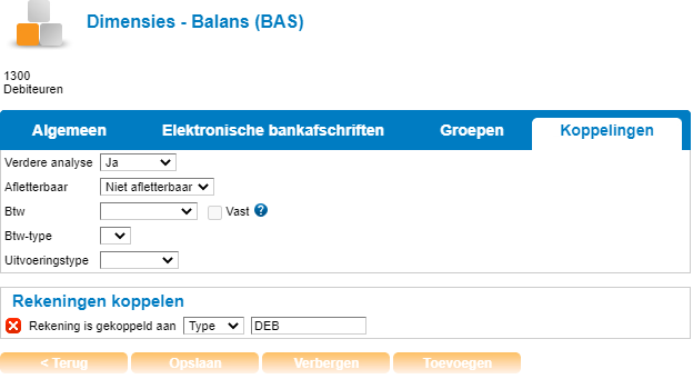 Deze balansrekeningen hebben in Twinfield Boekhouden de standaardinstelling 'Verdere analyse' op 'Ja' staan. Ga hiervoor naar Financiële professionals > Dimensies > Balans. Open de grootboekrekening voor Debiteuren en/of Crediteuren voor het opvragen van de instellingen.