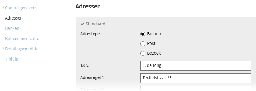 - Standaard: Zijn er meerdere adressen bij de relatie opgegeven, kies dan bij één van de adressen voor [Instellen als standaard]. Gebruik het [Prullenbak-icoon] om een adres te verwijderen (mits meer dan één adres). Het ingestelde standaardadres is niet te verwijderen.