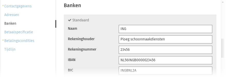 Klik eventueel op [+ Banken] onderaan het vak om meer rekeningnummers te koppelen. Geef bij meerdere gekoppelde rekeningen met [Instellen als standaard] aan welke rekening voor de relatie als standaard vast te leggen. Verwijder met het prullenbak-icoon eventueel het rekeningnummer dat niet als standaard is ingesteld.