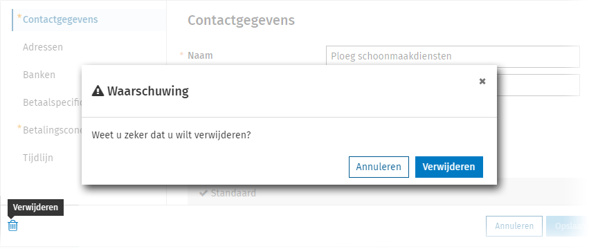 Vanuit het detailscherm van een relatie ('Inkoop > Leveranciers > Bewerk leverancier' of 'Verkoop > Klanten > Bewerk klanten') is het mogelijk om de relatie te verwijderen. Klik hiervoor op het 'prullenbak-icoontje' dat linksonder in het scherm beschikbaar is. Vervolgens verschijnt er een waarschuwingsmelding met de vraag om de verwijdering te bevestigen. Klik op [Verwijderen] om de relatie uit de lijst 'Leveranciers' te halen.