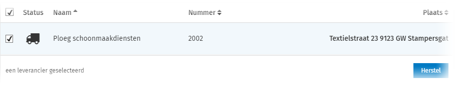 Vanuit deze lijsten is het een gemakkelijke stap om een verwijderde relatie terug te halen en dus te herstellen. Markeer de verwijderde relatie door het plaatsen van een vinkje en klik vervolgens op [Herstel] om de verborgen relatie terug te halen naar de lijst 'Leveranciers' of 'Klanten'.
