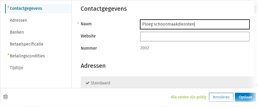 Pas vervolgens de velden in de beschikbare secties naar wens aan en sla daarna de wijzigingen op met behulp van de button [Opslaan]. De toepassing geeft een indicatie of alle ingevoerde velden een geldige waarde bevatten.