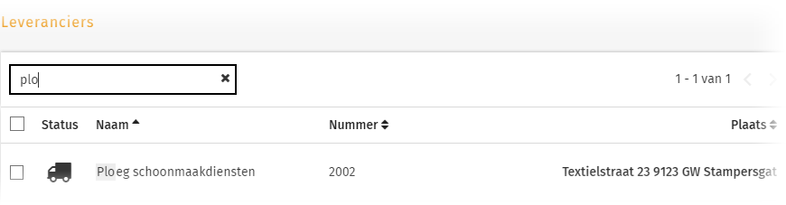 Eenmaal in de lijst 'Leveranciers' is het mogelijk om de gewenste relatie in de lijst op te zoeken. Gebruik eventueel de zoekfunctie om de gewenste leverancier snel op te zoeken. Vul in de bovenstaande zoekbalk een gedeelte van de naam of code in en klik vervolgens op de naam van de leverancier in de gefilterde lijst (plaats geen vinkje). De ingevulde stamgegevens van de leverancier verschijnen in beeld.
